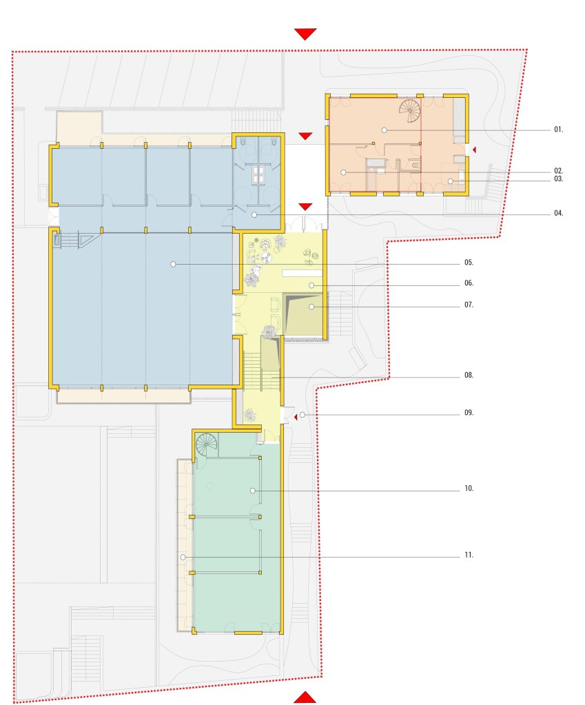 Le terrain est marqué par une forte déclivité reliant la partie hall haute jusqu’au bas de la sente piétonne et la rue en contrebas. Les 3 édifices principaux se développent à RDC ou R+1, encaissés dans cette pente et desservis par le hall et l’accès principal au site.