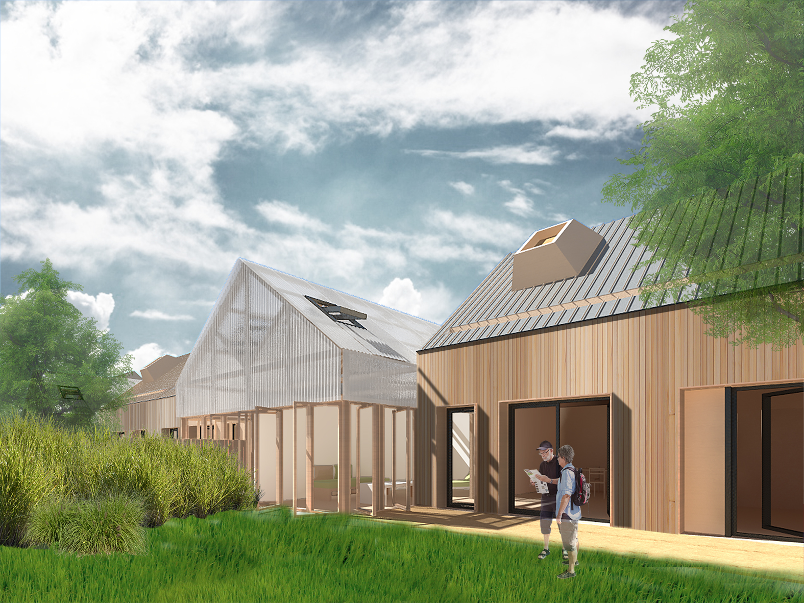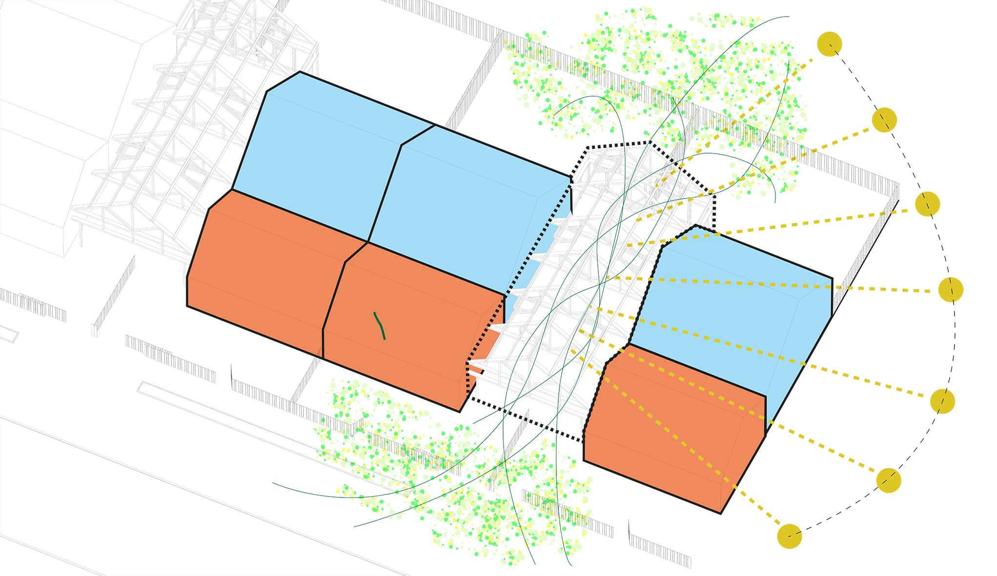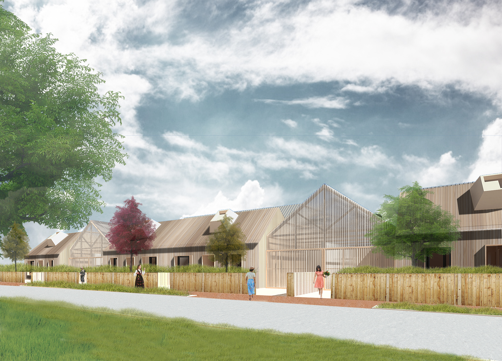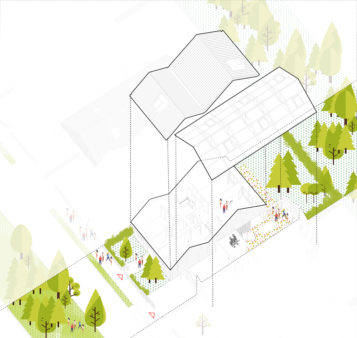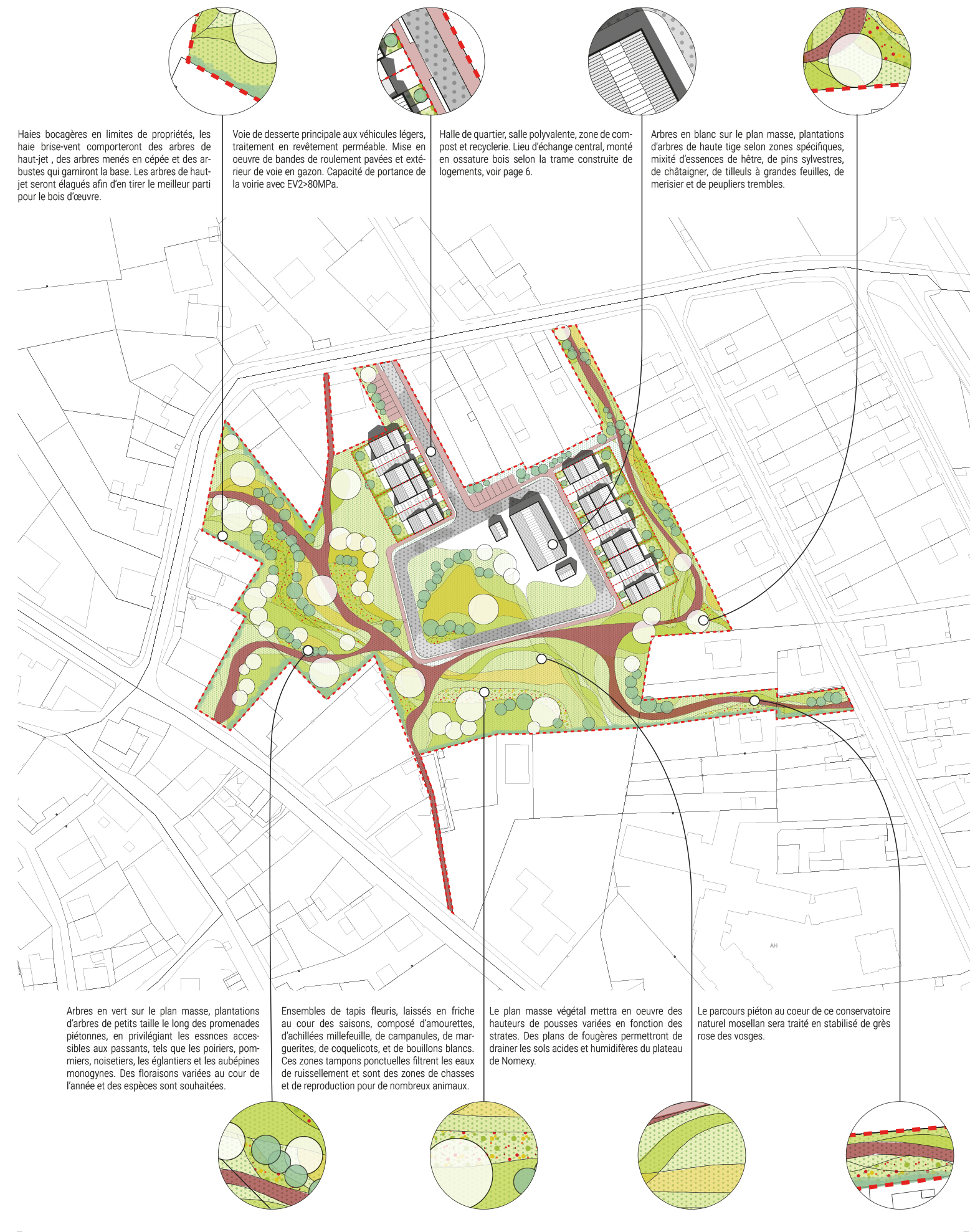 Le plan masse paysager en accord avec l’OAP, mettant en scène les paysages vosgiens est inspiré des tracés des méandres de la Moselle entre Nomexy et Bainville-aux-Miroirs, en mettant en oeuvre des strates paysagères d’essences locales, aux hauteurs, densités et couleurs différentes. En annexant au projet les parcelles 340, 153 et 154, nous créons ainsi une promenade circulaire en grès rose des Vosges, accessible aux riverains depuis les rues de l’Estrey, rue Jeanne d’Arc et rue de Lorraine et en reconnectant ainsi directement ces rues. L’implantation et la conception des logements se veut flexible et modulable afin d’optimiser le foncier à un instant T et dans le futur. Chaque logement est constitué de trois modules en structure bois. La mitoyenneté a été rompue en volumétrie en concevant des ensembles de jardins d’hiver qui permettront de générer une transparence entre la rue et le fond de parcelle et ramenant un maximum de lumière dans les logements à n’importe quel moment de la journée.