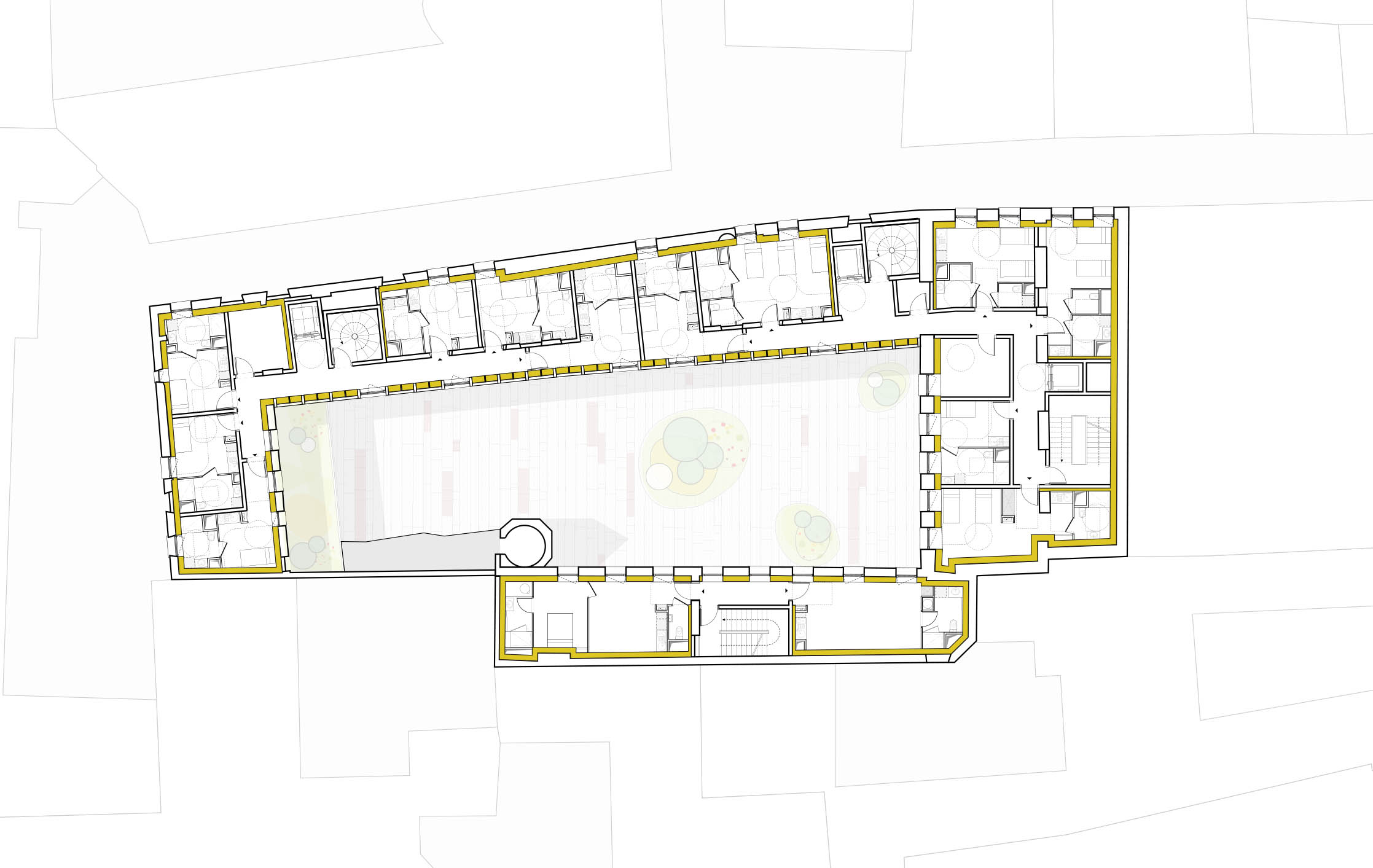 Dans notre projet, nous avons souhaité conserver un maximum de la volumétrie existante afin d’éviter un allongement des délais de chantier, un allongement du coût projet et un allongement des émissions de pollutions, de gravats, de CO2 et de matière à évacuer. Les nouveaux volumes en toiture ainsi que les différentes démolitions nous permettent de recréer une programmation cohérente avec de nouveaux accès.