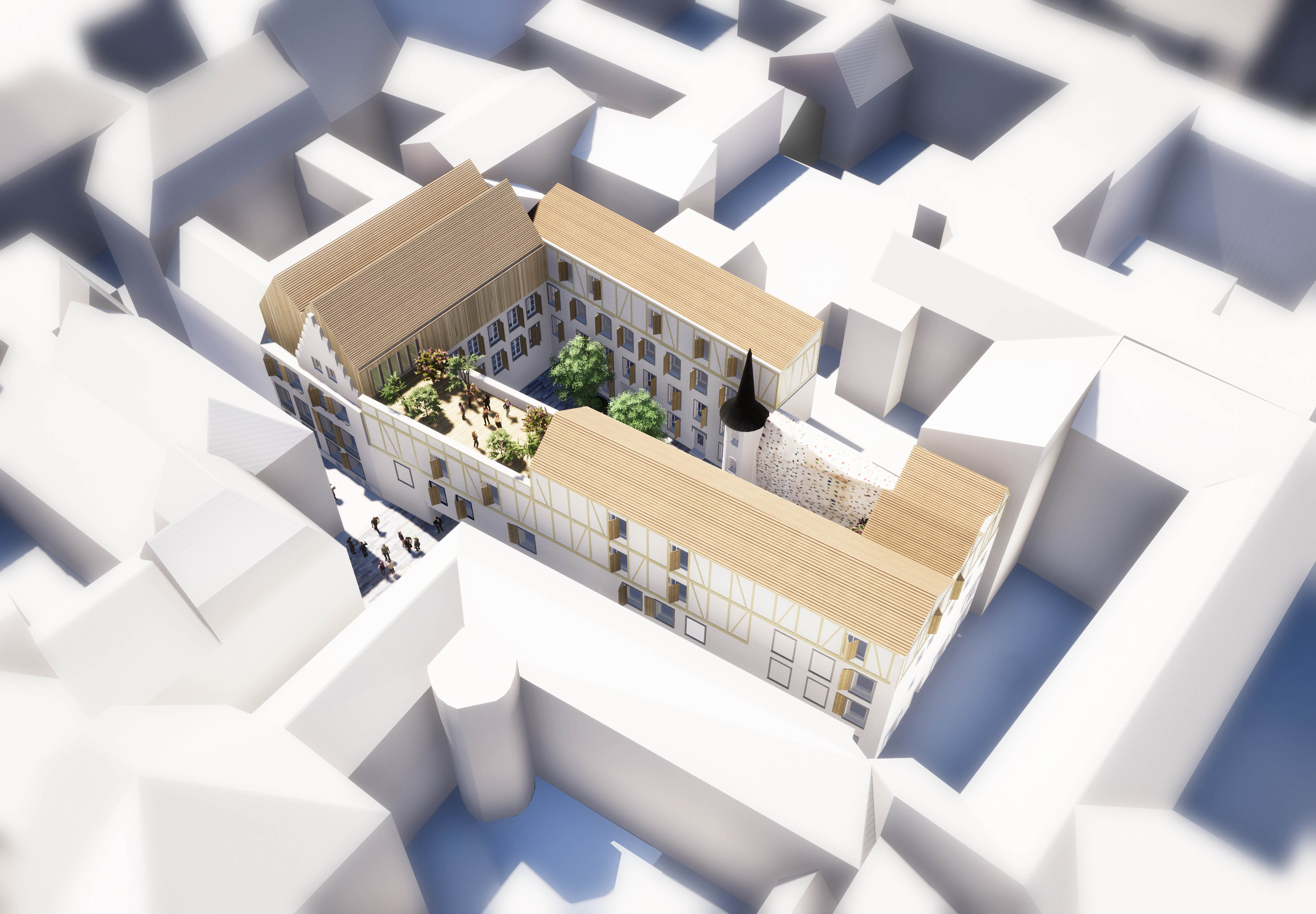 Ce choix d’extension et de réaménagement des toitures nous permet aussi de réaliser un chantier rapide et participatif. Les extensions sont modulées à l’air d’éléments autostables reprenant les structures à colombages traditionnelles alsaciennes, en ossature bois triangulées. Cela nous donne une structure plus légère, économe en ressources de chantier et en temps de construction.